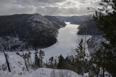 Вид сверху на залив, дорога зимника проходит по всему заливу - рыбаков и любителей загородных прогулок здесь много и зимой, и летом по воде.