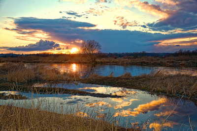 Последние лучи солнца отражаются в разливе реки.