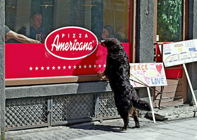 В эллипсе рекламной надписи не хватает только знака вопроса, это была бы первая фраза пса. Вторая - жируете?)))