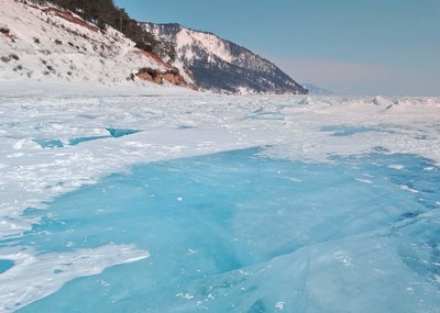 Лёд Байкала, в местах где снег сдуло ветром, очень чистый и имеет оттенки от синего до светло бирюзового.