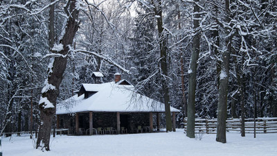 Старое кафе стоит в зимнем лесу