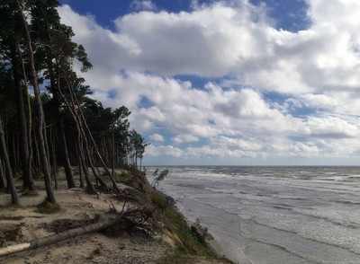 Балтийское побережье Гора «Шапка Голландца» (параболическая дюна, возвышающаяся на 24,4 м над уровнем моря) постоянно подвергается разрушению прибоем, поэтому на взморье спускается склоном высотой 20–22 м. Гора «Шапка Голландца» с давних пор была покрыта старолесьем из сосен и дубов и создавала большой контраст с распространяющейся вокруг песчаной равниной. |