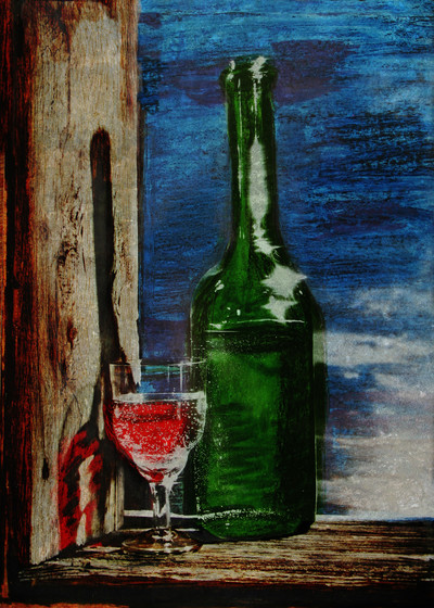 Vixtur, к серьезным неудачам я бы отнес а) конфликтные цветовые плоскости, зеленую и синюю (эти цвета рядом плохо сочетаются); б) грубые мазки на фоне неба на тучи вовсе не похожи и фон не украшают; в) похоже, что неудачную композицию не только я заметил; г) что побудило исказить форму бутылки справа? д) Ваша фантазия распространяется гораздо дальше банальной бутылки и бокала на окне и вряд ли стоит ее так ограничивать.