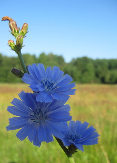 Идем по деревенской дороге, а цикорий смотрит на нас синим глазом.