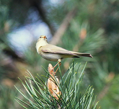 Пеночка-весничка Семейство Славковые - Sylviidae. В Беларуси - Ph. t. acredula, по западу республики - переходная зона между Ph. t. acredula и Ph. t. trochilus. Обычный гнездящийся перелетный и транзитно мигрирующий вид. Весьма широко распространен в республике. Маленькая (намного мельче воробья), стройная, подвижная птичка. Окраска оперения довольно однотонная зеленовато-серая, с более светлым желтоватым низом и такой же светлой бровью. По бокам хвоста белые пятна. Ноги желтоватые или серовато-бурые. Все пеночки внешне очень похожи; в руках весничка отличается от других видов соотношениями длины маховых перьев: первое первостепенное маховое у нее значительно длиннее верхних кроющих перьев кисти, второе первостепенное маховое короче пятого, но длиннее седьмого. Вес самца 8-14 г, самки 7-14 г. Длина тела (оба пола) 11-11,5 см, размах крыльев 18-19 см. Длина крыла самцов 6-7 см, 4,7-6 см, цевки 2 см, клюва 1 см. Длина крыла самок 6-6,5 см, хвоста 5-5,5 см, цевки 1,8-1,9 см, клюва 0,7-0,9 см. |