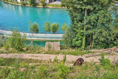 Они гуляют в огромном вольере, связанном с медвежьей ямой, который находится на среднем уровне, а люди гуляют по верхнему или нижнему.