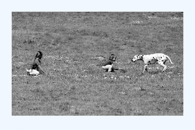 Две сестрёнки, гуляющие на лужайке в Коломенском, к которым прибежал совершенно посторонний далматин. Май 2018