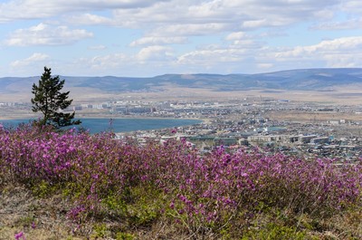 На Титовской сопке цветёт багульник. Вид на оз. Кенон.