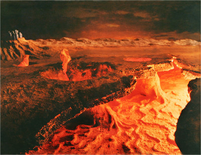 О! Пейзаж Венеры - просто супер! Именно так всё и обстоит на поверхности зловещего близнеца Земли: всюду вулканы, выбрасывающие сернистый газ в её и без того токсичную атмосферу, реки расплавленной магмы и вечно краснокоричневое небо, по которому плывут облака из серной кислоты. Наглядная иллюстрация ада в нашей Солнечной Системе, рождённая постигшей когда-то планету катастрофой.