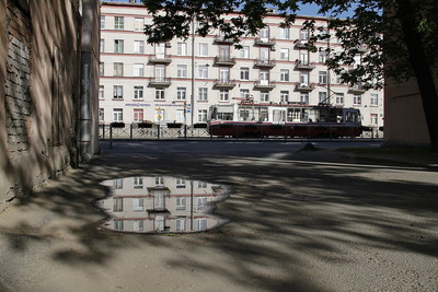 Внимание приковано к освещенному дому и трамваю, и эта часть выгодно выделена естественным образом т. е светом. Без натуги без ухищрений.без фолтошопа. Автор классически выстроил кадр так, что по бокам расположены затененные стены домов.Они лепят объем всей картинки Зрительно, они воспринимаются, как театральные кулисы, как бы образуют просцениум, в глубине которого и совершается движение трамвая. Совершается городская жизнь. Чтобы разлепить передний и задний планы между ними помещена лужа с отражением. Она удлиняет перспективу, создает пространство. Эту же роль выполняют кружевные тени деревьев. Снимок насыщен объемом и выигрышными тональным переходами, привязанными к планам. Композиция выстроена так, что подчёркивает движение, сосредоточивает внимание на нем. Это движение трамвая.