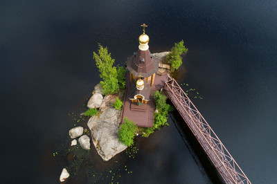 Церковь апостола Андрея Первозванного на реке Вуоксе. Вид с высоты, аэрофотосъемка. Ленинградская область, Россия