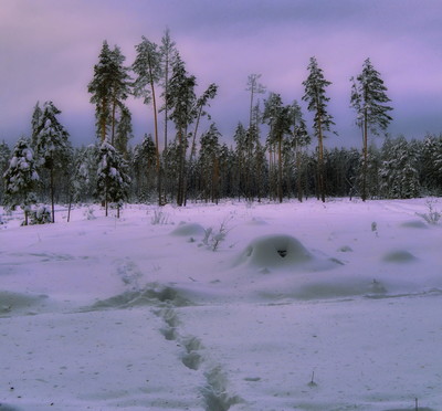 Сиреневый вечер в зимнем лесу