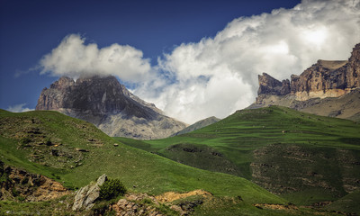 КБР. Окрестности Былымских озер. Гора Науджидзи, спрятавшаяся в облаках и фрегмент скалистого хребта. Весна.