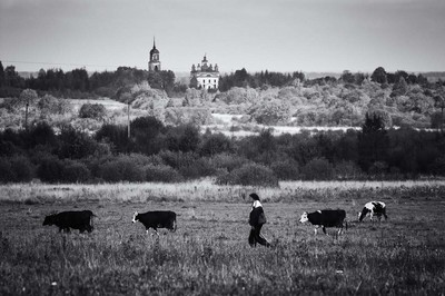 Тетушка гонит коров в поле у Бежецк осенью 2009