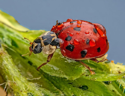 яркая... скажите, она сидит на листике или в воздухе висит?...
