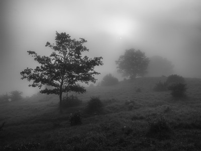 Солнце светит на поляну сквозь туман у Радикофани весной 2018