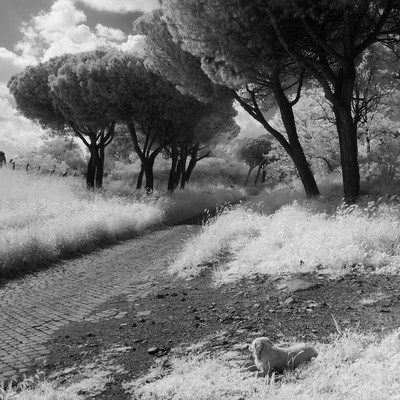 Собака мирно лежит на Аппиевой дороге весной 2018