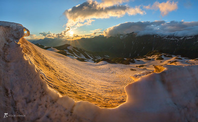 Ледники тают в горах Абхазии от жаркого летнего солнца. Справа, в облаках, Кавказский хребет.