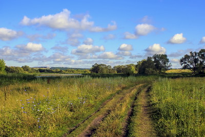 По берегу к озеру, по дорожке прямиком... По дорожке к берегу озера. Утро у озера. Центрально-Черноземная часть России, Воронежская область, Малышево. Пейзаж-день. Утро на берегу озера. К которому движение по дороге вдоль летней растительности, по краям васильки, полевые цветы... Высокая зеленая трава. Вдали слева линия озера. И горизонт с облаками. Плывущие по голубому небу. Облака. |