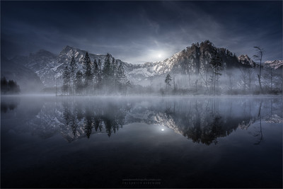 Morgens bei Monduntergang am Almsee in Oberösterreich.