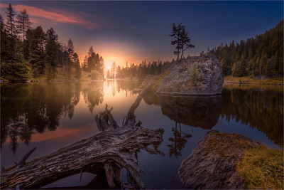 Если не учитывать принципы распространения света от источника (солнца), то сюжет и композиция хороши. Если учитывать - то ляпы: солнце низко, а коряга и валун-остров освещены с теневой стороны...как и берег слева.