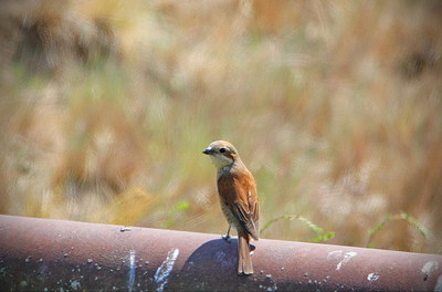 ЖУЛАН (Lanius collurio) Грычун малы (раней - Жулан) САМКА. Длина тела составляет 16—18 см, размах крыльев — 28—31 см, длина крыла — 93 мм, масса тела — 28 г. Самец окрашен ярче и контрастнее самки. Верхняя часть тела у самцов красноватая. Голова серая, через глаза проходит типичная для данного семейства чёрная полоска — «маска». Нижняя часть тела слегка розоватая, хвост черно-белый с таким же рисунком, как у каменки. У самок и молодых птиц верхняя часть тела коричневая с извилистым рисунком. Нижняя часть тела тёмно-желтого цвета с таким же рисунком. Поёт обыкновенный жулан редко, песня тихая, представляет собой неясное щебетание. Чаще можно услышать резкие выкрики жулана, напоминающие жужжание — «чррек», «жжек» |