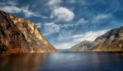 Очень живописный вид! С голубым небом фьорд выглядит очень гостеприимно.) Я проплывала по этой красоте под хмурым серым небом, было совершенно другое настроение, хотя тоже было очень красиво.