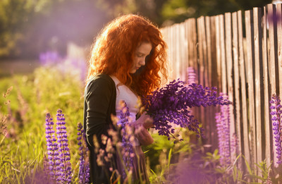 Основная проблема, это несоответствие осей основных фрагментов сцены, и второстепенных.Ось люпинов в руке и лицо должны совпадать по основной точке резкости, но захват произошёлпо волосам ,и частично цветам среднего плана в районе локтя.Одновременно видно отсутствие даже банального софт-отражателя (лист ватмана ) подсвечивающего лицо.Поэтому контр его подубил ровнонастолько насколько это понятно для тебя.Не хватает резкого взгляда модели , к чему