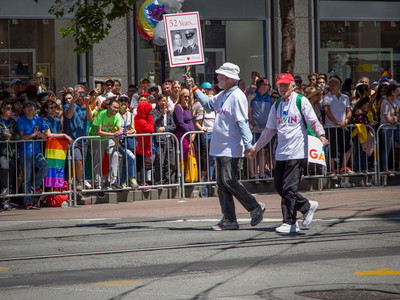Это самый скромный и трогательный снимок из всего репортажа. 52 года вместе! Два старичка идут отдельно от всех, держась за руки. А на плакате, который они несут, фотографии двух бравых военных ещё со времён войны во Вьетнаме. И кто теперь может бросить в них камень?