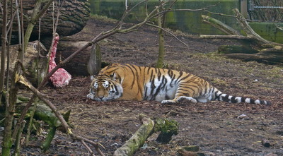 Сытый Амурский тигр в вольере Хельсинского зоопарка