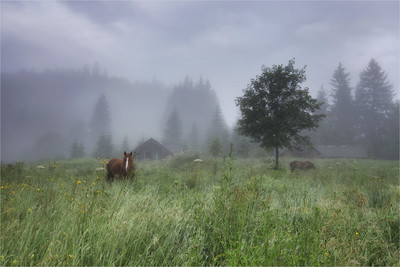 По высокой траве ходят лошади тихо.