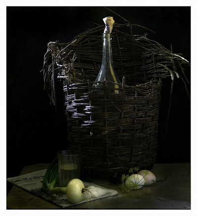 Наряду со светом в натюрморте важна гармония подобранных предметов. Не украшательство картинки предметами, а сложенная руками автора подобность реалий жизни, фрагмента быта. Если пропустить корзину для бутля самогона, и газету на иностранном языке, как задумку автора на "продвинутость" сельского натюрморта, то никакой сельский житель не будет сыпать столько соли для двух яиц и тем более есть соцветия укропа со стеблем