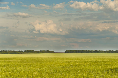 Ветер создаёт иллюзию мелкой волны на поле пшеницы а на горизонте "берег" из лесополосы с "протокой " на вспаханное поле.