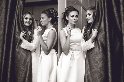 интересный момент - девушка справа смотрит в зеркало, а в отражении на камеру. хотелось, что бы вторая девушка смотрела на камеру, а в отражении - вдаль. НМВ, так было бы интереснее. а на исходнике оба платья белые? ширма какого цвета?
