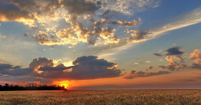 Небо в огне.Уходящее солнце.Облака.Поле хлебов...