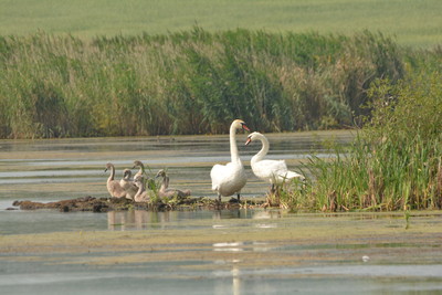 Прекрасная лебединая семья на островке .