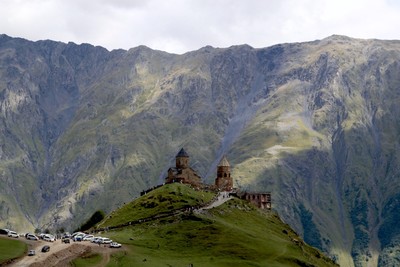 Путешествие по Грузии Гергетский монастырь, а вокруг – горные пейзажи неописуемой красоты. Фоном церкви с колокольней являются южные склоны Большого Кавказского хребта, а чуть далее возвышается величественная гора Казбек. Чтобы увидеть пик горы, желательно посетить эту церковь в ясный день, но погода в горах переменчивая, поэтому сложно предугадать, когда он будет виден. Бытует мнение, что гора показывает свою вершину только людям с положительной аурой. |
