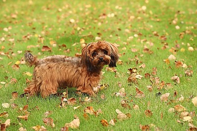 Собачка среди осенних листьев.