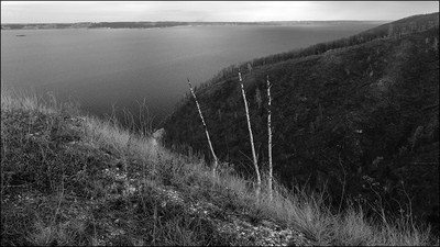 пейзаж с тремя стволами и корытом в 2010 здесь горел лес. по осени склоны и тропинки были покрыты слоем пепла, на котором следы обуви оставались не хуже, чем на луне. пепел смыло, стволы остались. и лежать, и торчать. молодецкий курган, окрестности. |