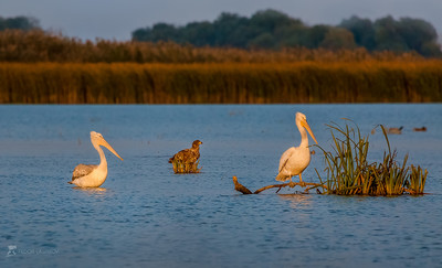 Троица – пеликаны и орлан На закате. На снимке кудрявый пеликан и орлан – белохвост. Птицы внесены в Красную книгу РФ. Из осенней фотоэкспедиции по Астраханскому заповеднику. Фотопроект «Дельта Волги». Дамчикский участок, Астраханского заповедника. Середина октября, 2018 г. |