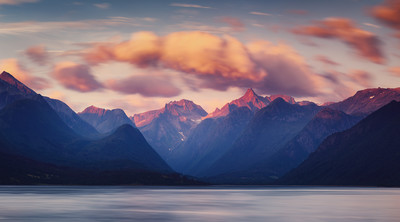 Последнее прикосновение вечернего солнца к верхушкам гор над Ромсдаль-фьордом. Длинная выдержка.