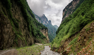 Теснина. Теснина Кармадонского ущелья. Северная Осетия. Где-то здесь остановилась сокрушительная лавина. По правой стороне, все еще виден уровень-срез лавины. В непогоду и дождь, место вызывает особые ощущения....Да и в ясную погоду, солнце здесь бывает не долго, из-за огромной высоты окружающих ущелье скал. |