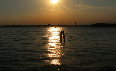 Закат в Венецианской лагуне. Вид с острова Лидо на Венецию.