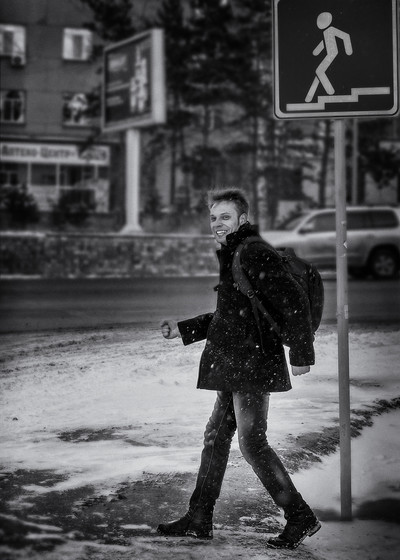 Станиславский не поверил бы: белые капли "снега" видны только на фоне темной фигуры. Или, возможно, его просто обрызгали известкой перед съемкой?