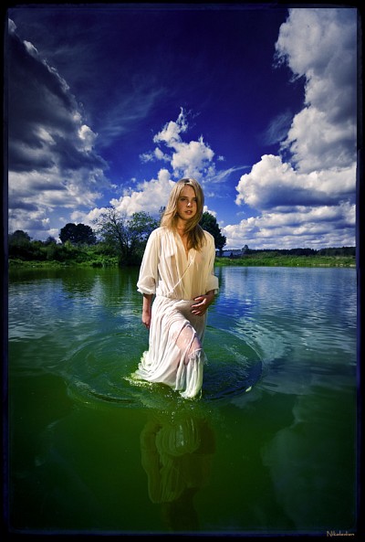 Очень необычная "своеобразная" работа в цветовом решении. Холодные отттенки антуража и идущая "теплая осень." Все это приковывает внимание, одних отталкивает, а других манит....