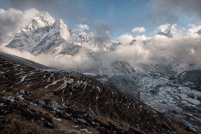 Снеговые тучи в окрестностях Ама-Даблам Точка съемки на высоте 4600м. В левой части снимка гора-красавица Ама-Даблам (6814м), справа в долине можно рассмотреть земельные участки небольшого селения Фериче (4200м), это последний населенный пункт на пути к Эвересту, в котором постояннр проживают люди, выше только туристские приюты. 2 марта, примерно 16.30. Мне за полтора часа надо обязательно дойти до скрытого облаками распадка, который виден в левой части кадра непосредственно перед Ама-Даблам, потому что в 18.00 станет темно, как ночью. Там селение Дингбоче (4410м), где меня ждет ночлег, доброжелательная хозяйка, теплая печь в столовой, ужин и вкусная выпечка. |