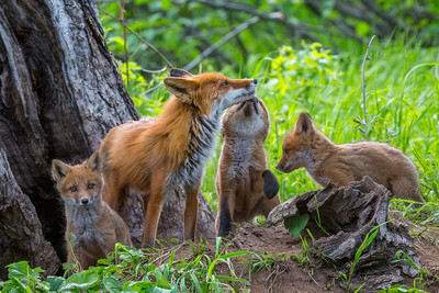 Камчатка. Мама лиса вернулась с охоты, и лисята тут же выбежали ее встречать.