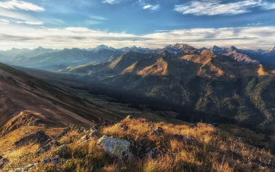 КЧР, окрестности Архыза, утро на Загеданском хребте с видом на г. Закзан-Сырт и далекий ГКХ.