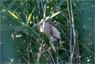 Выпь малая наблюдает из зарослей камыша