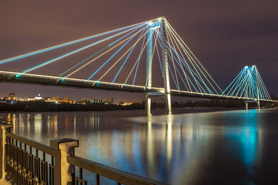 Виноградовский мост вечером. Пещеходный вантовый мост в г. Красноярске соединяет исторический район "стрелка" с островом Татышев. В этом году была смонтирована подсветка, которая придала мосту новый облик в вечернее время. |